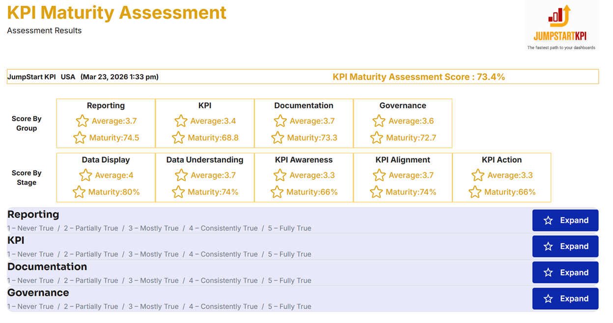At JumpstartKPI, we talk a lot about KPI maturity. We help clients figure out whether they’re truly managing performance — or just producing dashboards. And we built a 50‑question KPI Maturity Assessment to give organizations a clear, objective score across reporting, data quality, governance, ownership, and performance culture. So, this week, I decided to turn the spotlight on ourselves.